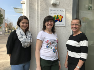 Besuch einer Teilnehmerin (mitte) am Praktikumsplatz durch Steffi Ballhaus von der Johanniter Akademie (rechts) und Theresa Antl von der ÖJAB (links).