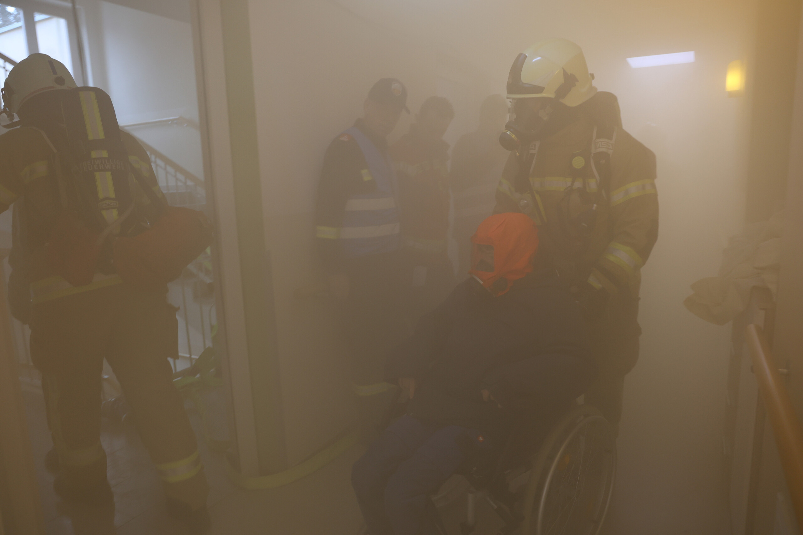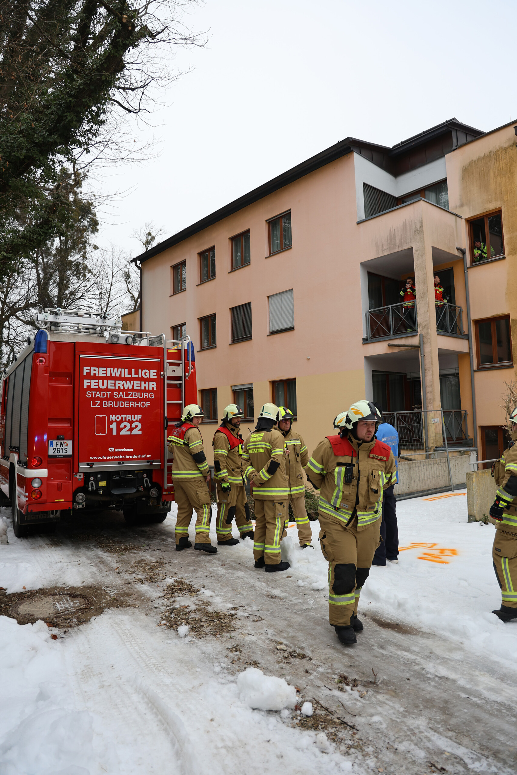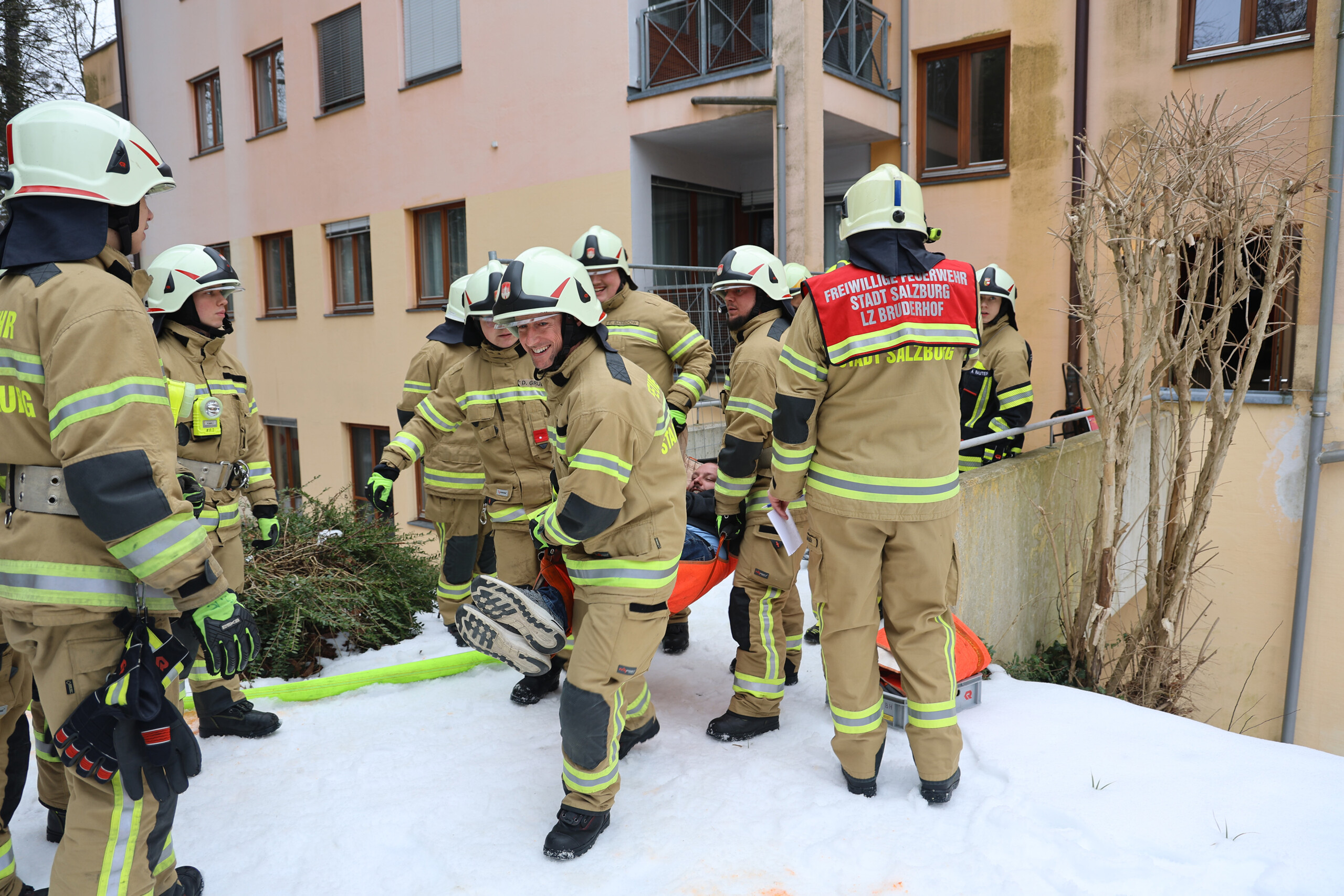 Feuerwehr-Brandschutzübung im leer gewordenen Teil des ÖJAB-Pflegewohnhauses Salzburg – Pressefotos