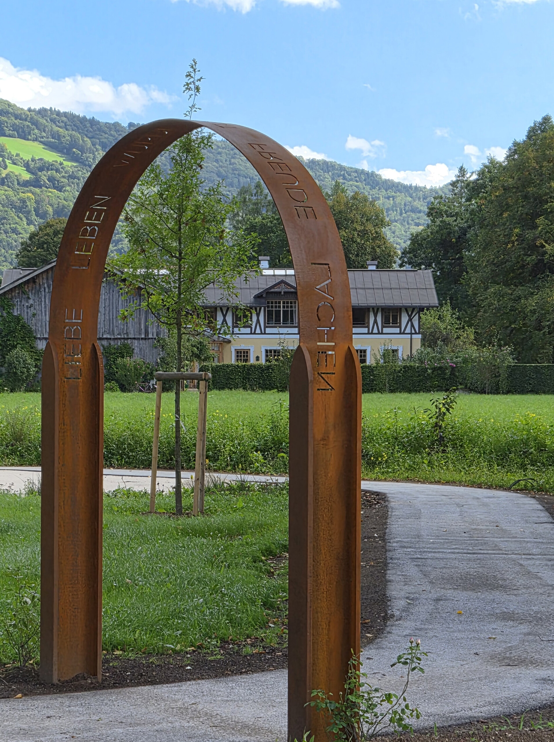 Bild 7: Die Innenbereiche und der Park des ÖJAB-Pflegewohnhauses Salzburg werden von der Künstlerin Birgit Schweiger mitgestaltet. Beispielsweise lädt im Park ein Cortenstahl-Bogen mit Worten voller Lebensfreude zum Durchschreiten ein. – Foto: Birgit Schweiger.