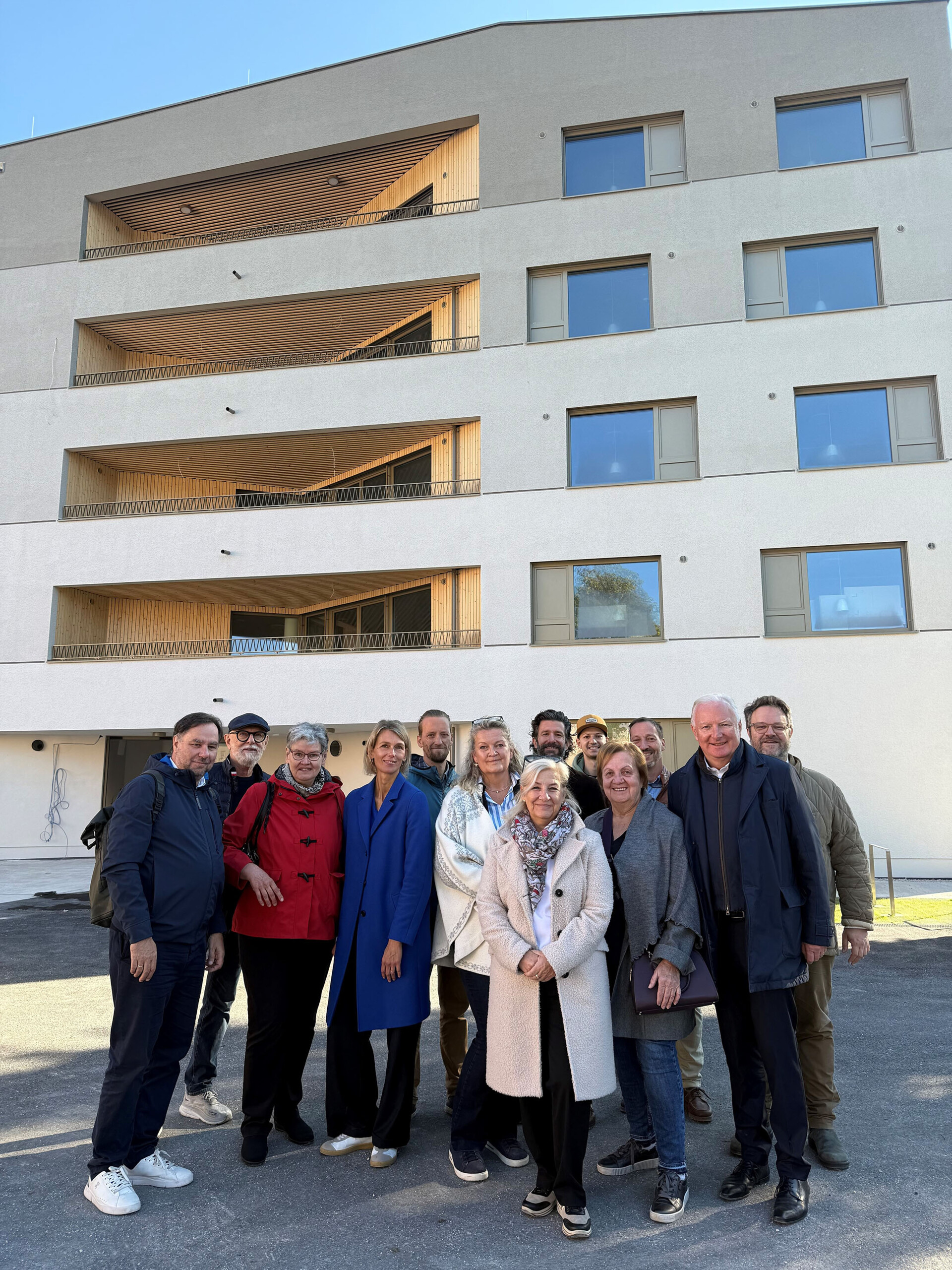 Personen von links: Anrainer Rupert Wolff, Baumeister Andreas Kranawetter (Baustellenaufsicht), Baustellenzone-Geschäftsführer Dominik Hofinger, Architekt Bernhard Anglberger, Stv. ÖJAB-Geschäftsführerin Monika Antl-Bartl, ÖJAB-Geschäftsführerin Monika Schüssler, Sozial-Stadträtin Andrea Brandner, Architektin Stephanie von Krempelhuber, Wohnbau-Landesrat Martin Zauner, Vizebürgermeister Florian Kreibich, Architekt Patrick Kofler, Gesundheits-Landesrätin Daniela Gutschi, ÖJAB-Projektleiter Andreas Gruber, Bauzone-Geschäftsführer Christian Schaurecker, Oberrater-Bau-Geschäftsführer Patrick von Sobbe, Stv. ÖJAB-Geschäftsführer Harald Pöckl, Andreas Aigner (Oberrater Bau), Bürgermeister Harald Preuner.