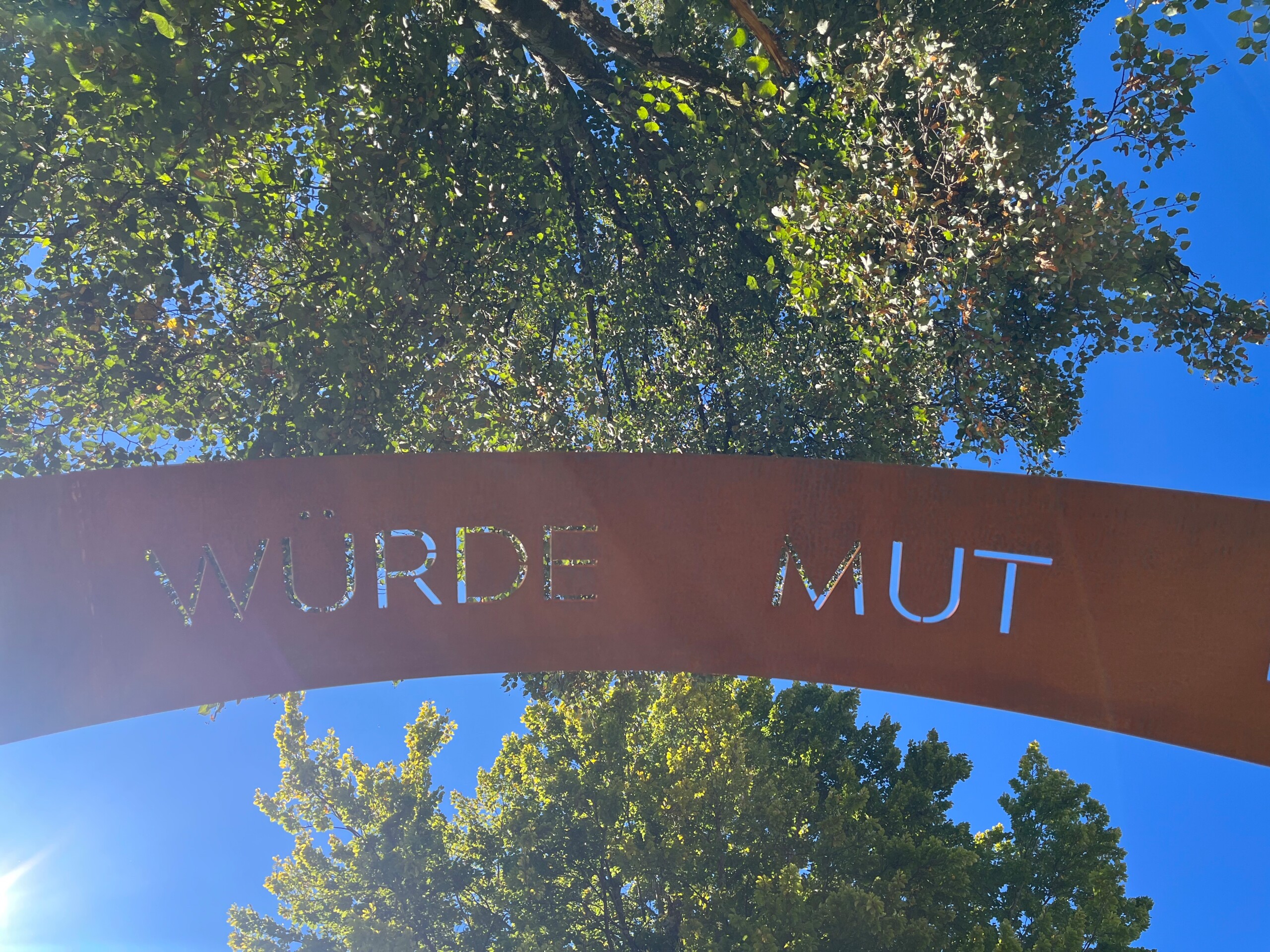 Bild 8: Der Himmel leuchtet durch Worte wie „Würde“ und „Mut“: Ein Ausschnitt des Cortenstahl-Bogens der Künstlerin Birgit Schweiger im Garten des ÖJAB-Pflegewohnhauses Salzburg. – Foto: Birgit Schweiger.