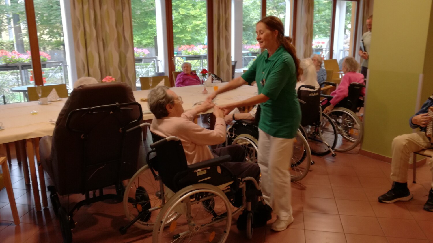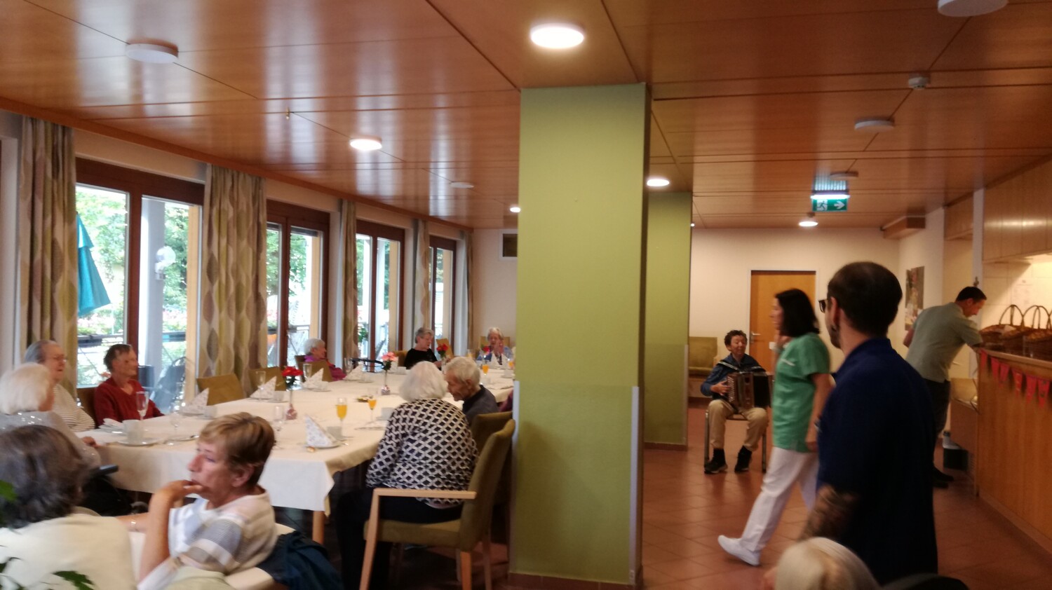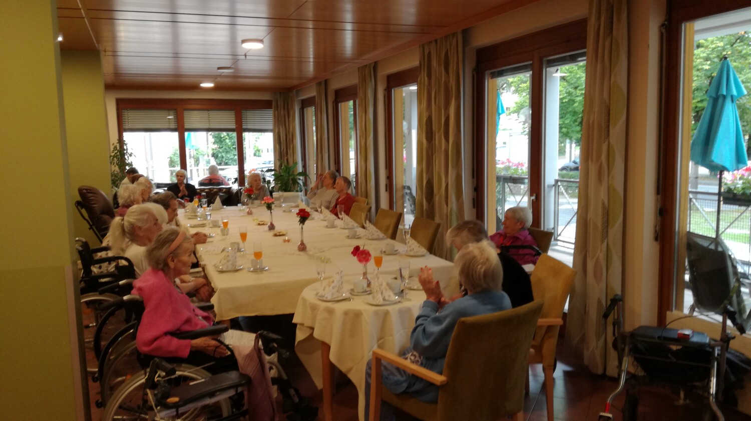 Für unsere Geburtstagskinder des jeweiligen Monats sowie für in diesem Monat neu eingezogene Bewohner:innen veranstalten wir jeden Monat in unserem Speisesaal eine Feier, bei der unser beliebter Kurti ehrenamtlich mit seiner Ziehharmonika (immer noch!) aufspielt. Nicht fehlen darf natürlich eine Geburtstagstorte, Kaffee und etwas zu Anstoßen. So lässt es sich feiern!