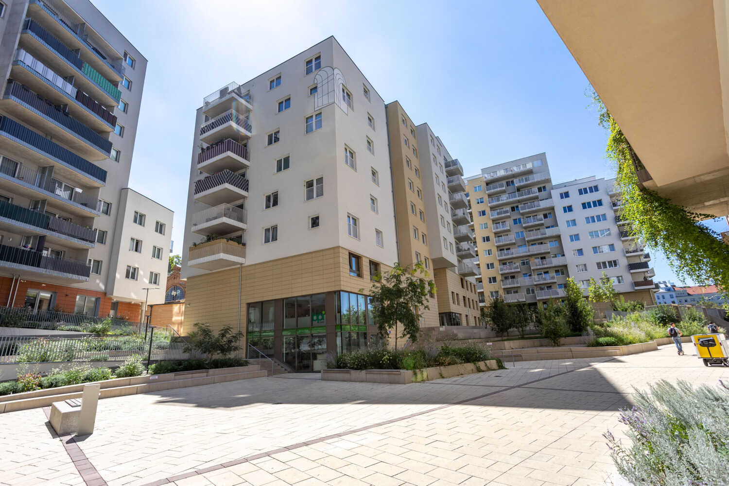 Das Berufspädagogische Institut (BPI) der ÖJAB (Bildmitte) am intergenerativen und integrativen "Lebenscampus" im neuen Wiener Stadtteil Wolfganggasse. Am Lebenscampus Wolfganggasse befindet sich auch der Wiener Standort von AusbildungsFit ÖJAB, das moderne ÖJAB-Pflegewohnhaus Neumargareten und das neueste Studierendenwohnheim ÖJAB-Haus Remise.