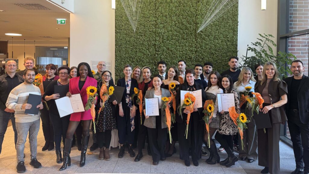 Absolvent:innen und Lehrkräfte der Pflegeschule der ÖJAB 2025 beim gemeinsamen Gruppenfoto auf der Abschlussfeier im ÖJAB-Pflegewohnhaus Neumargareten in Wien.