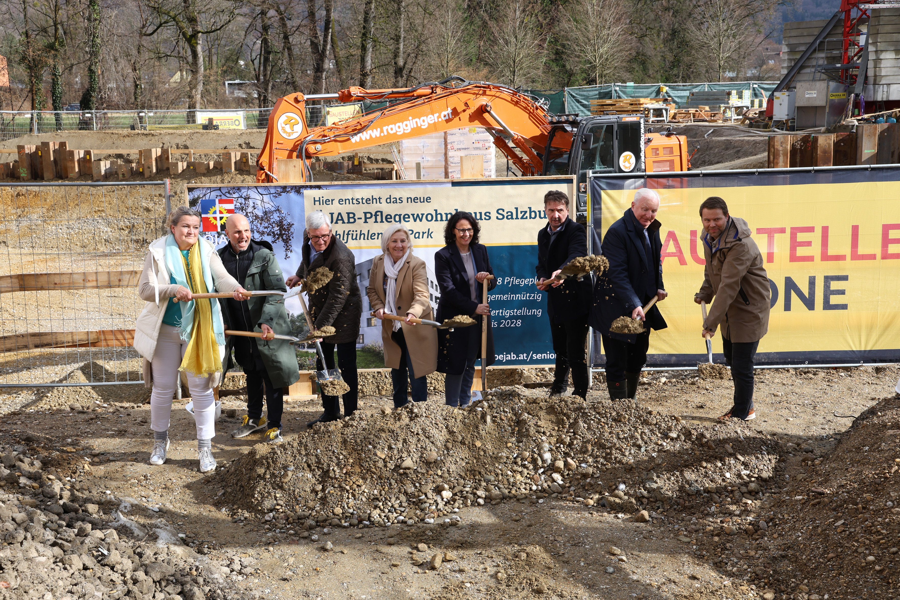 Bild 3: Spatenstich für das ÖJAB-Pflegewohnhaus Salzburg – Wohlfühlen im Park, von links: Bürgermeister Harald Preuner, ÖJAB-Geschäftsführerin Monika Schüssler, Sozial-Stadträtin Andrea Brandner, Gesundheits-Landesrätin Daniela Gutschi, Wohnbau-Landesrat Martin Zauner, Stv. ÖJAB-Geschäftsführer Harald Pöckl, ÖJAB-Projektleiter Andreas Gruber, Vizebürgermeister Florian Kreibich.